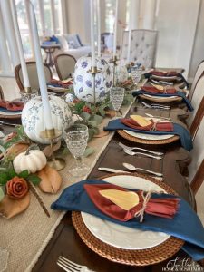 Designers are shaking up the traditional orange-and-brown palette with navy, teal, and soft aqua accents. These cooler tones modernize fall color stories and look stunning alongside natural wood, brass, or terracotta. Try navy napkins with amber glassware for a fresh take on the Thanksgiving table.