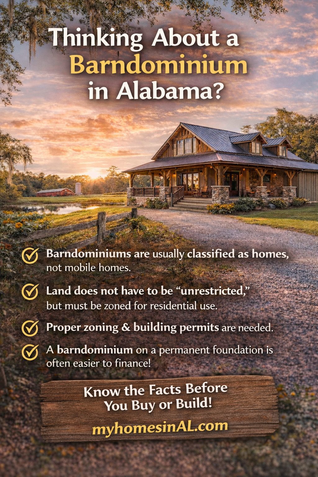 Barndominiums are becoming increasingly popular across Alabama. From rural farmland to lakefront property, many buyers are asking whether a barndominium is considered a mobile home, whether land must be unrestricted, and how zoning works in Alabama real estate.